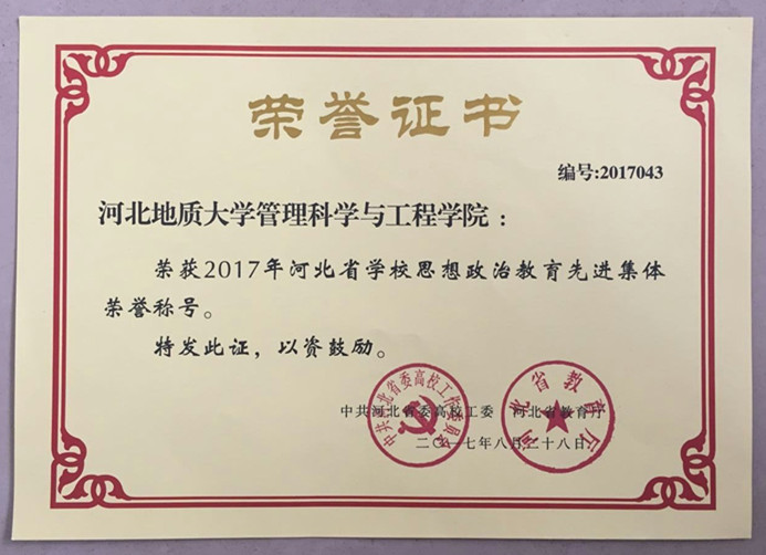 管理科学与工程学院荣获2017年“河北省学校思想政治教育先进集体”荣誉称号,这是我校今年唯一一个获得此项荣誉的学院。