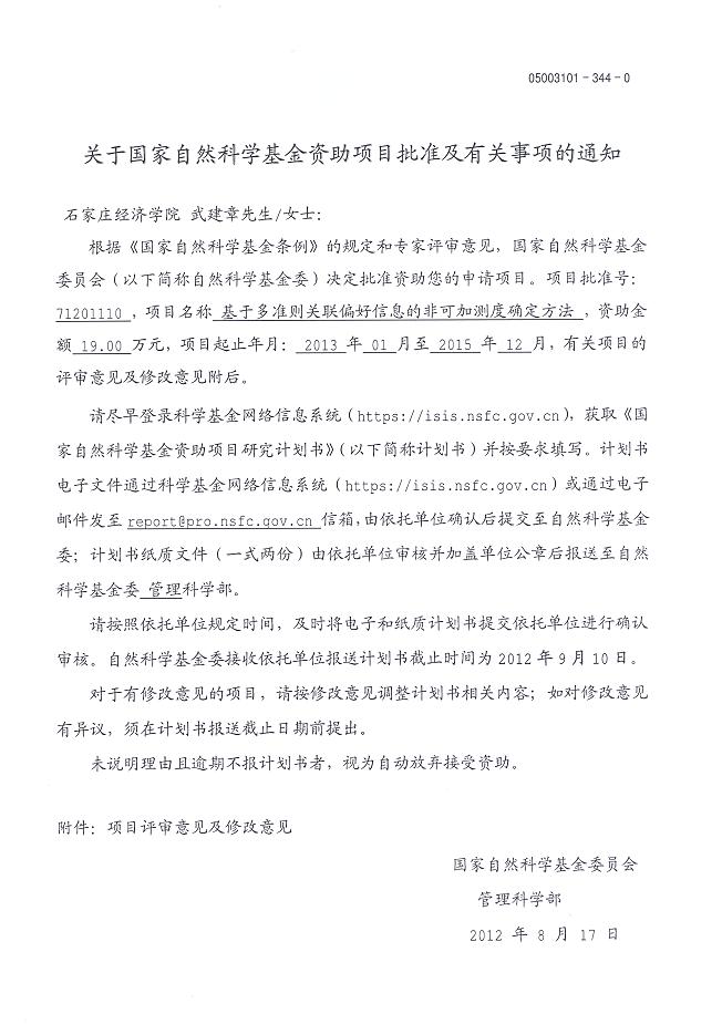 我院武建章博士获得国家自然基金资助项目,这是我院首次获得国家自然基金项目,希望我院老师们在今后的科研工作中多参加国家项目的申报,有更高的目标。