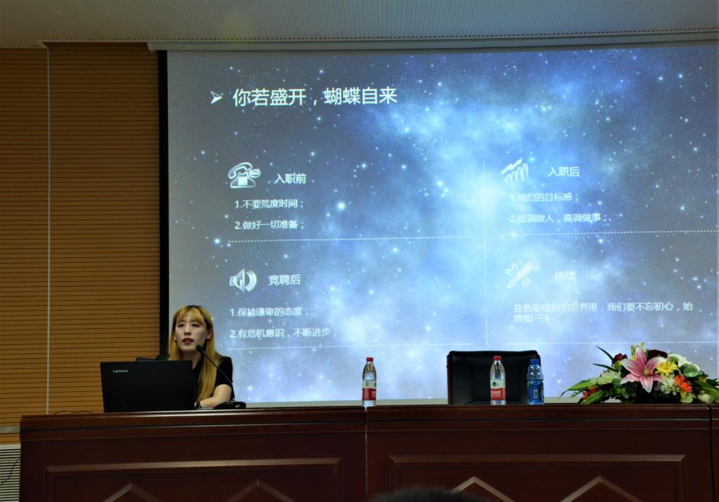 曹月婷以自己大学四年的学习经历及求职历程,为我院同学上了宝贵的一课。着重就专业知识、社团实践、课外阅读等方面阐述了她自己的看法及独到的观点。她指出,学好专业知识是一个学生在大学阶段应该做到的基本素养之一,学生对于其专业知识所掌握的扎实程度,决定了日后的能力以及能够发展的平台的高度。因此,学好专业知识对于学生而言显得尤为重要。与此同时,既要掌握好专业知识又要积极地参加各类社团活动也是一名优秀大学生所应具有的素质。曹月婷在大学阶段曾担任辩论队教练和文艺部部长的职位,这不仅锻炼了她的应变能力、组织能力和协调能力,丰富的社团活动也为她日后应聘求职打下了坚实的基础。毕业一年,曹月婷从职场新人到部门经理,成为公司入职时间最短、年龄最小的管理者,她用自己的经历告诉同学们,只要有目标,只要肯努力,没有到达不了的高峰。